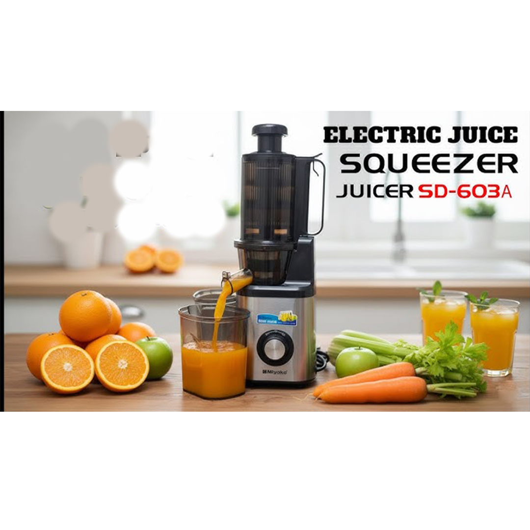 - The Miyako SD-603A Vertical Slow Juicer is designed for juice lovers who want maximum yield with minimal effort. Powered by a 500W copper motor, it operates at 60–80 RPM for slow, nutrient-preserving extraction. Its self-feeding design allows easy juicing of fruits and vegetables, while the non-drip spout prevents spills. Enjoy fresh juice every day with high efficiency, reverse & self-cleaning functions, and safe operation at 220–240V / 50–60Hz.