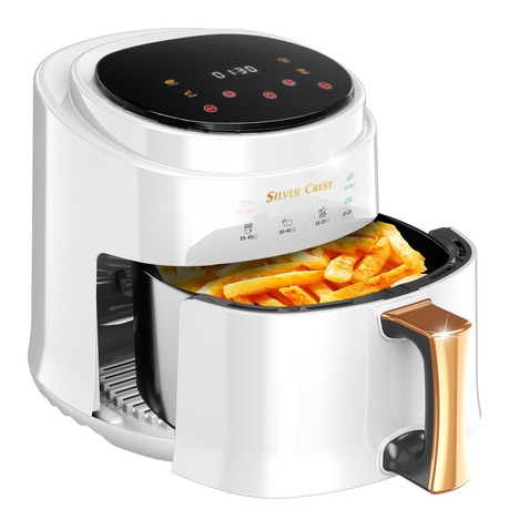 Silver Crest Hot Air Fryer XXXL Touch Control Digital Display So healthy can be delicious! The freemax hot air fryer prepares a wide range of dishes in a healthy way - almost completely without fat and oil. In the 360° air flow, ingredients are gently heated and wonderfully crispy on all sides. Valuable vitamins and healthy nutrients are preserved by the gentle cooking process. The hot air fryer is particularly versatile and prepares a wide range of dishes: whether golden yellow chips, savoury steaks, exotic shrimps, even delicious chocolate cakes, you can succeed with the hot air fryer. The operation of the Air Fryer is very easy via touch buttons and an easy-to-read LCD display. Quick settings are available for the most popular dishes - so you can get to your favourite dish with just a few finger tips. Cleaning is also easy: The smooth surface, without protruding buttons, can be easily wiped clean and all removable parts can be cleaned in the dishwasher. The non-stick coating of the cooking basket ensures easy removal of food, without sticking residue. Enjoy the healthy lifestyle now: with a hot air fryer from Silver Crest
